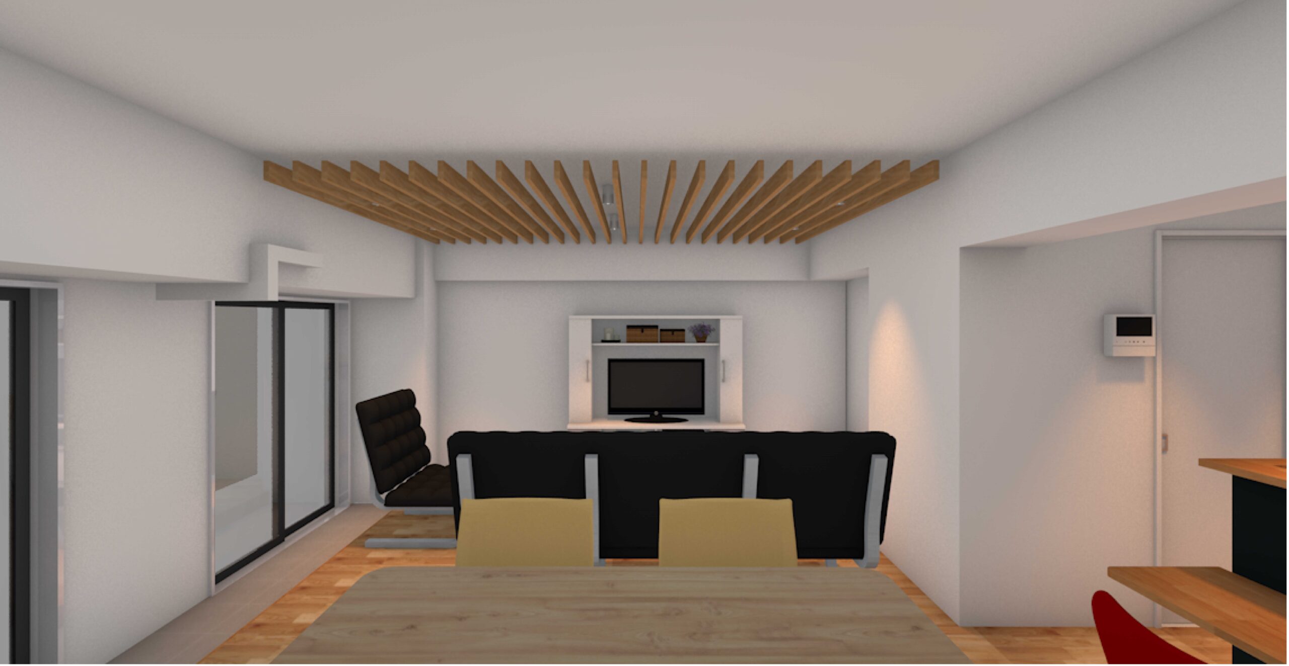 リビングダイニングの空間に柱が微妙な配置となっておりその位置を活かし、収納のあるTV掛け壁を設け、ダイニングテーブルの配置する柱とキッチン袖壁間に造作の収納付きベンチを設けた空間。