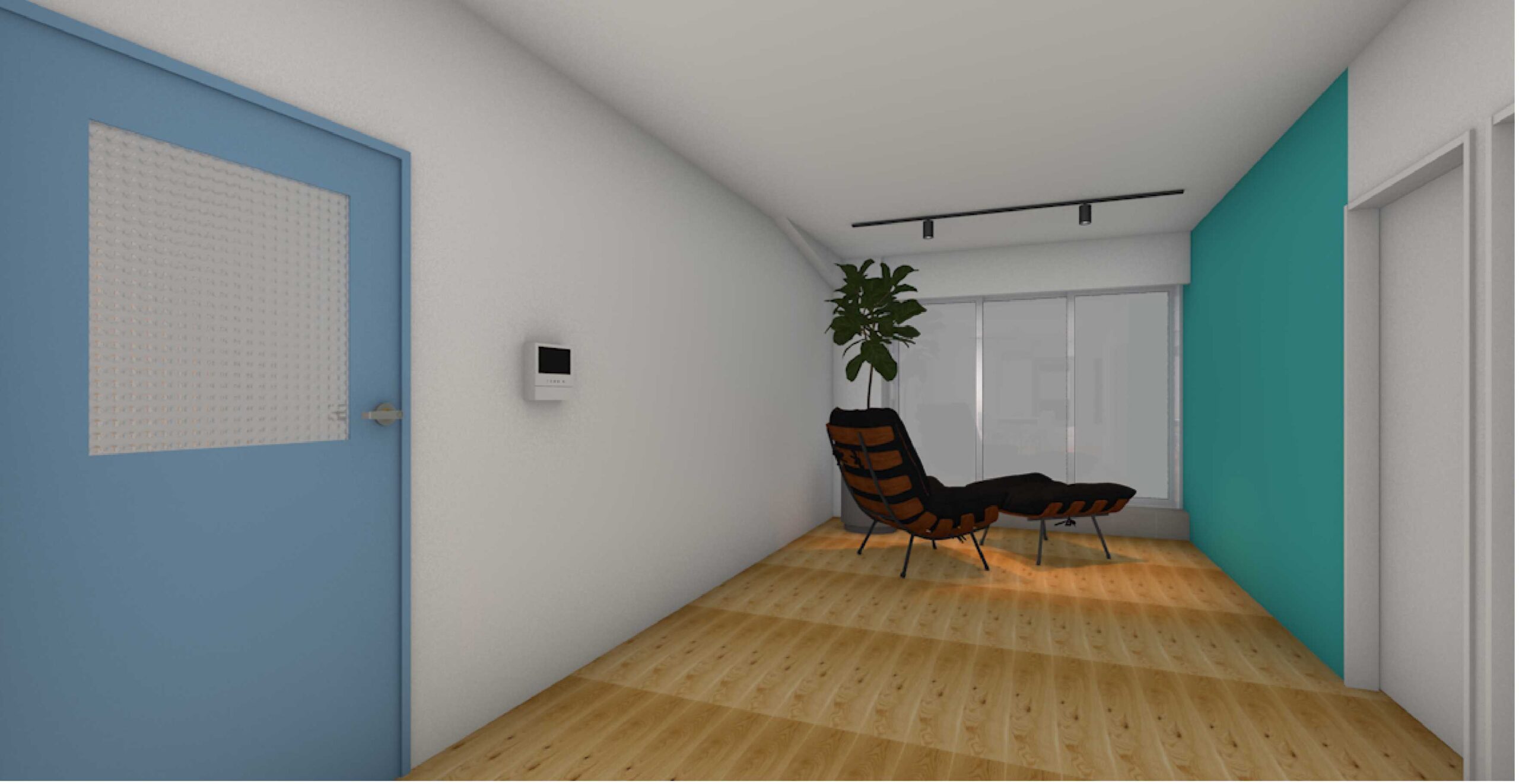 インダストリアル感を十分に活かしつつベースの白塗装の壁と天井に部屋の間仕切り壁を青塗装で空間にアクセントを付けた空間デザイン。