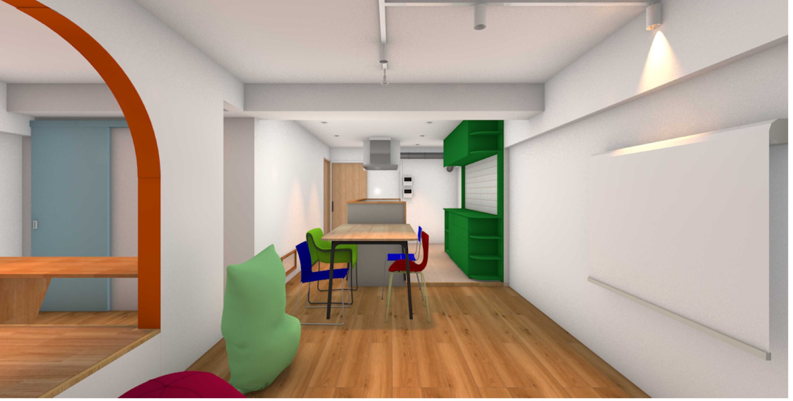 カラフルな色合いを差し色に小上がり、ワークスペース、ダイニングキッチンのつながりのある空間デザインに、玄関からリビングにつながる廊下に洗面カウンターを設け今の時代に合わせた動線プラン。