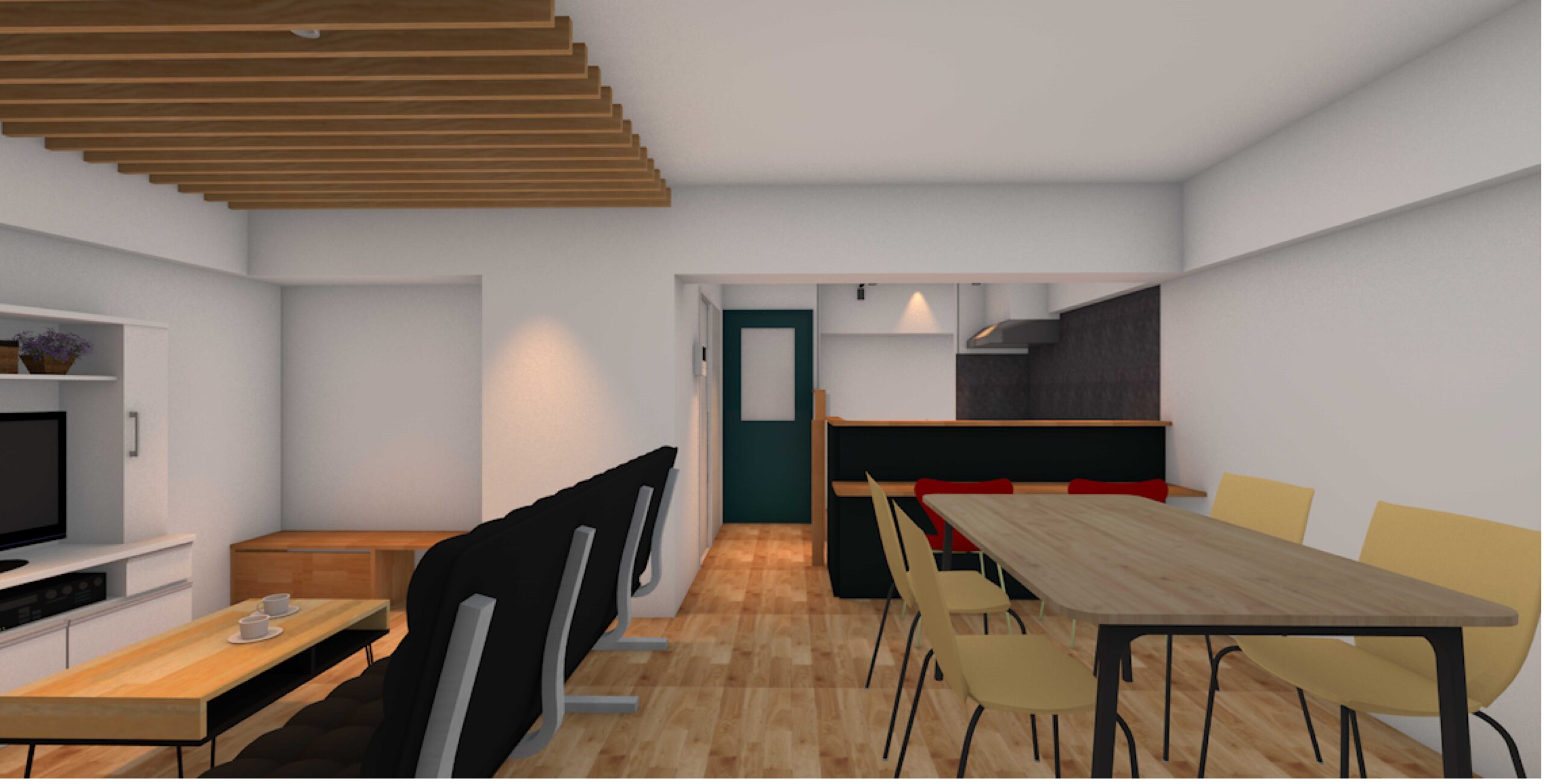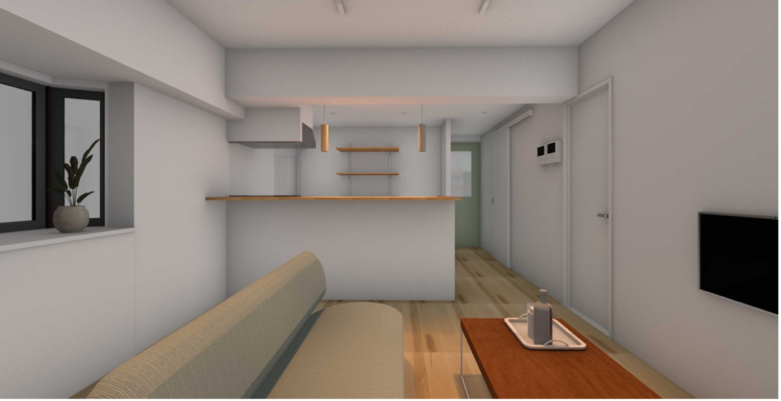 無垢の面材を使ったキッチンをアクセントにLDKのデザインをした空間に間仕切り壁で一部を仕切りワークスペースとLDKのつながりを持たせた空間プラン。