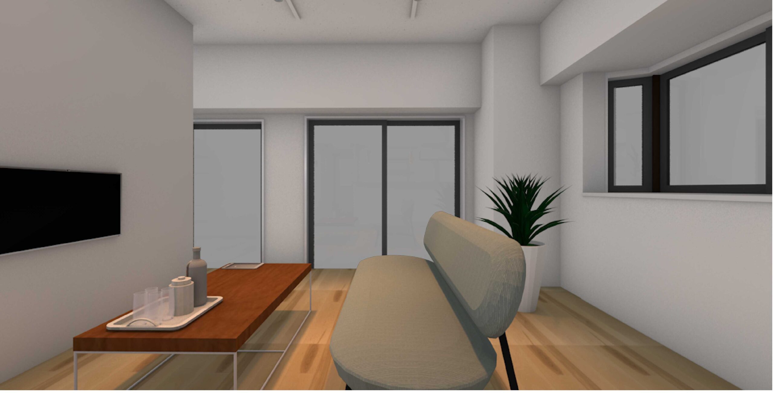 単身者のためのワークスペースとLDKをバルコニーからの最高を取り入れつつ配置し、トイレと洗面室の間仕切りを無くして一つの空間として単身者として利便性を優先した空間デザイン。