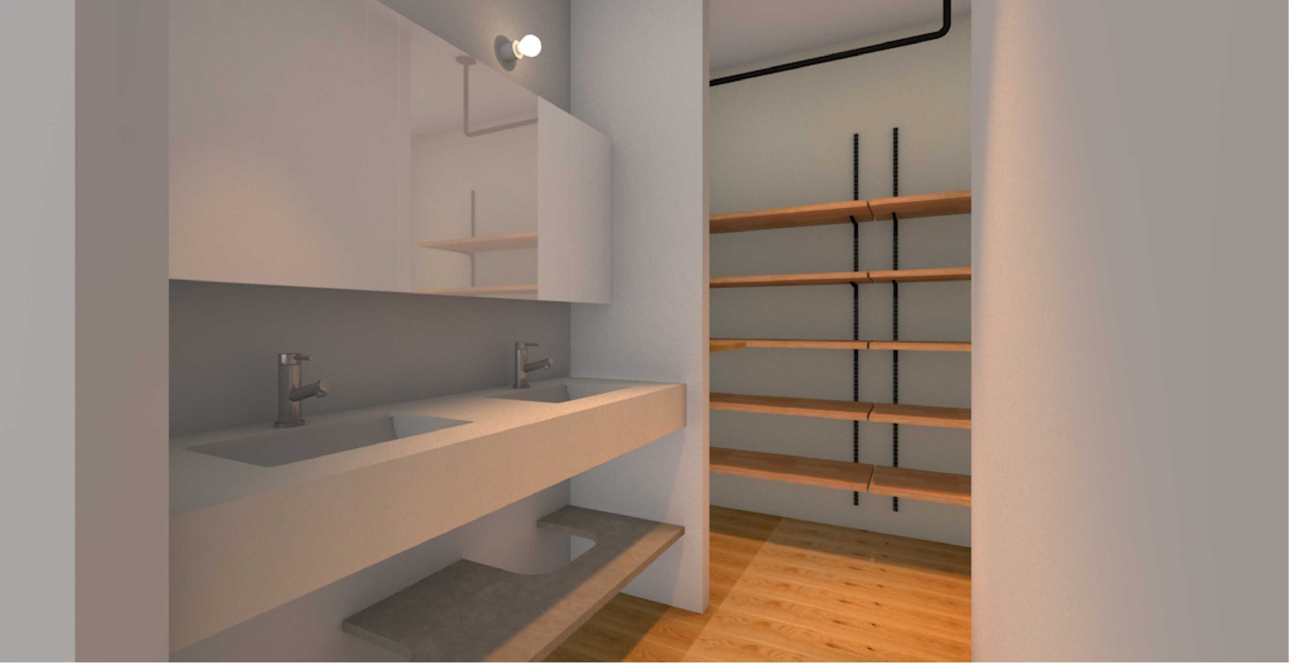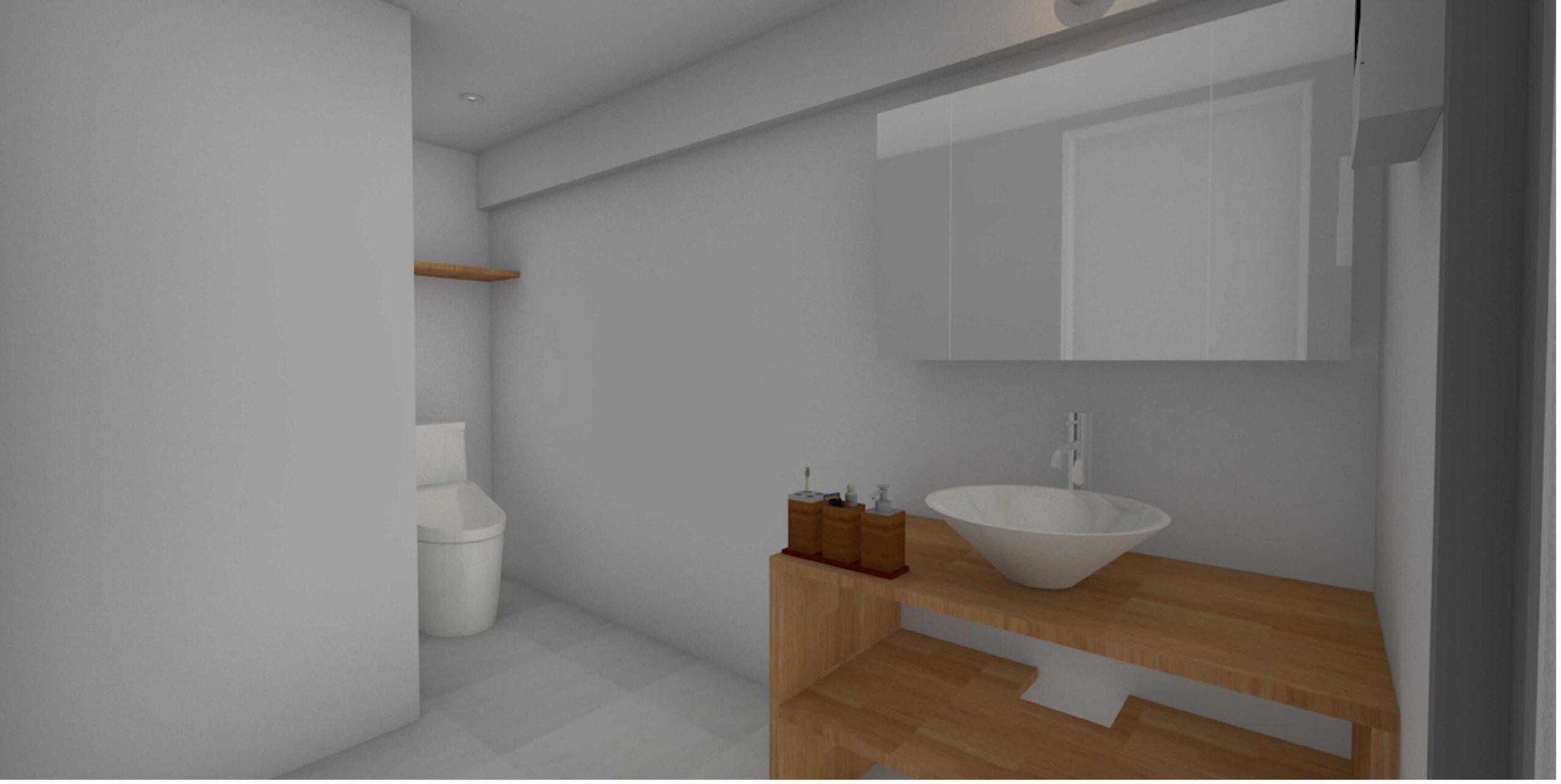最小限に必要な洗面台と洗濯パンだった空間をトイレの空間と一体とし元々の洗面台と洗濯パンの位置を分けてゆとりのある洗面室空間をプランしたデザイン。